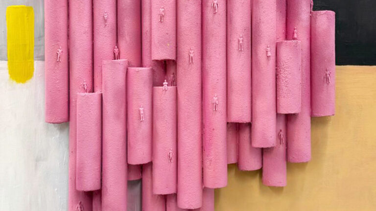 Mia Kolarin teokset yhdistävät maalausta, tekstiiliä ja kohollaan olevia muotoja tavalla, joka tekee niistä sekä katsottavia että tunnusteltavia kokemuksia.